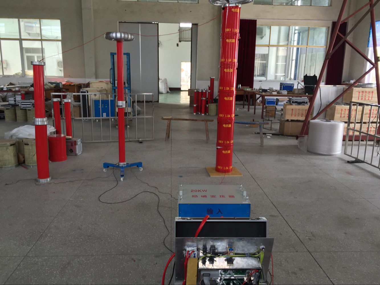 2. 设备的重量和体积大大减小。串联谐振电源中,不但省去了笨重的大功率调压装置和普通的大功率工频试验变压器,而且,谐振激磁电源只需试验容量的1/Q,使得系统重量和体积大大减小,一般为普通试验装置的1/5~1/10。