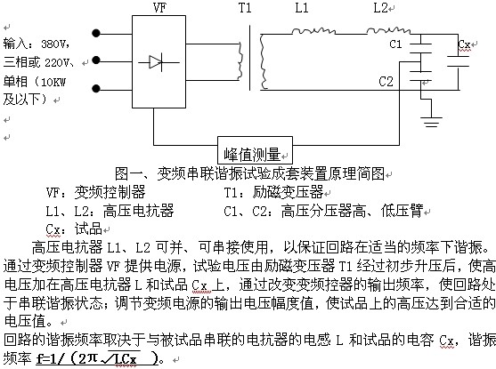 变频控制器集调压、调频、控制及保护功能为一体,省去了笨重的调压器,而且操作方便、读数直观。由于系统Q值较高(30-120),有效地解决了由于电源容量的不足对现场试验的制约。当电压等级较高时,电抗器采用多级或叠积式结构,便于运用输及现场安装。