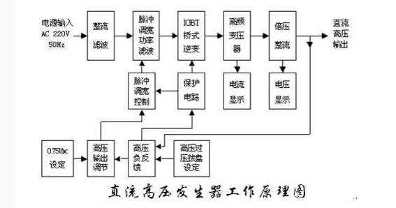 把单相50此HZ交流电源经双向可控硅的单相桥式整流器后获得的可调直流电压,经滤波进入变换器产生中频交流,经过中频升压脉冲变压器和倍压整流产生60KV,120KV和200KV直流高压,设有低压直流负反馈电路,低压直流过流分配制度电路。ZGF型中频直流高压发生器有输出电压60KV,电流2MA;输出电压120KV,电流2MA,输出电压200KV,电流2MA。并具有0.75UI=1mA,输出电压200KV,电流2 mA。并具有0.75UI=1Ma电压及电流显示功能